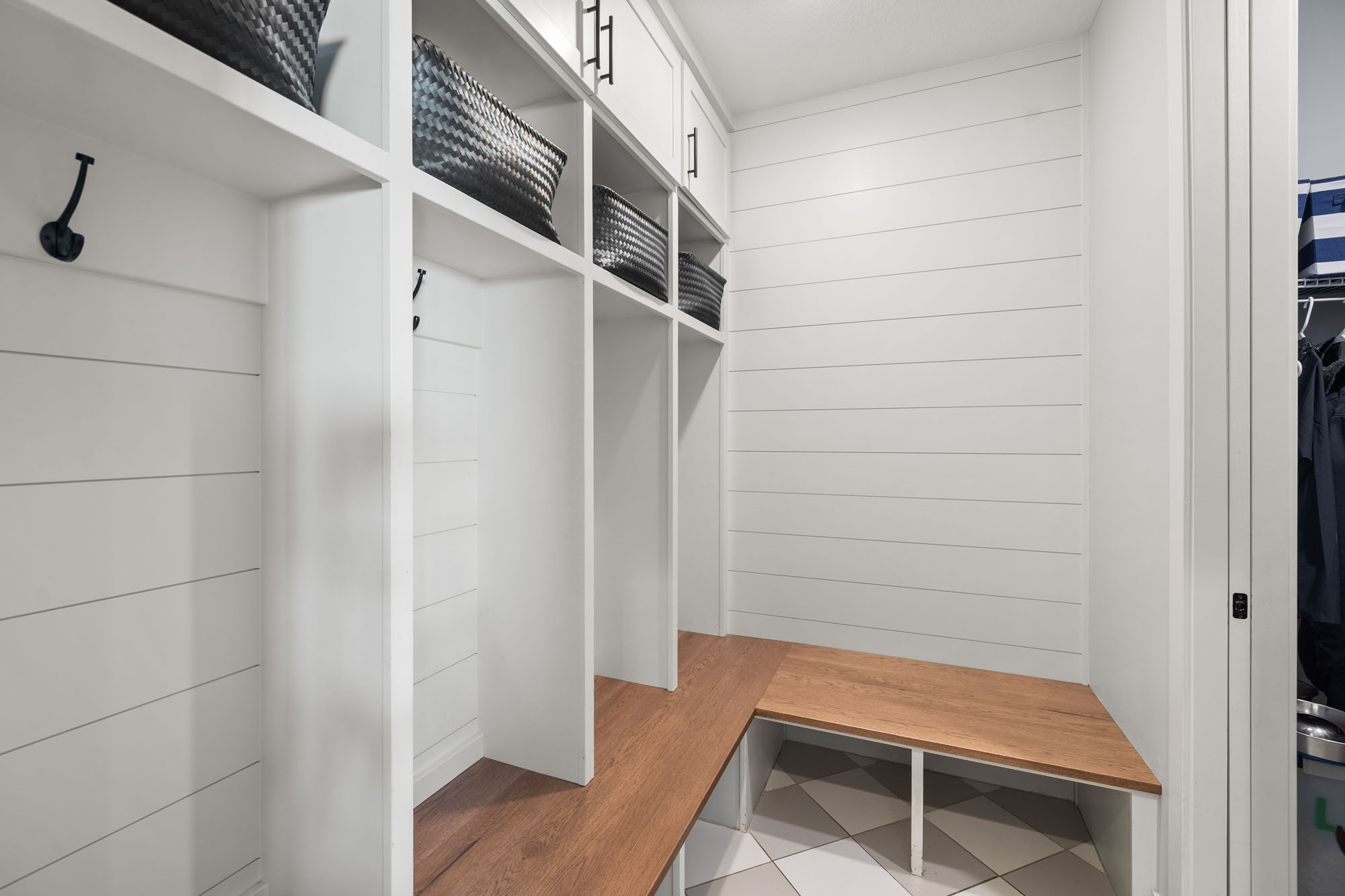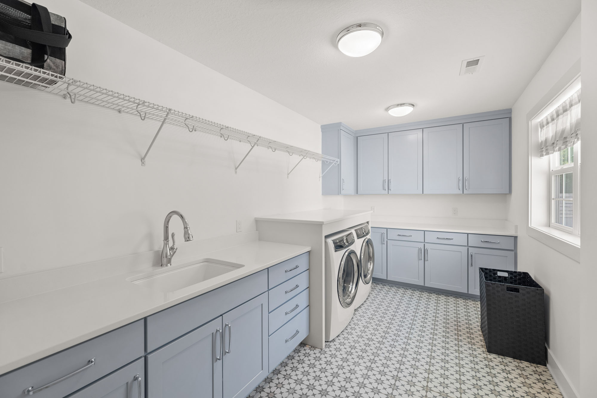 Convenience continues on the upper level with a full laundry room, washer and dryer, soaking sink, abundant cabinets, and expansive counters for folding and storage.