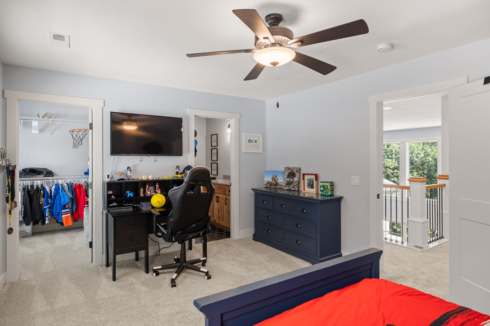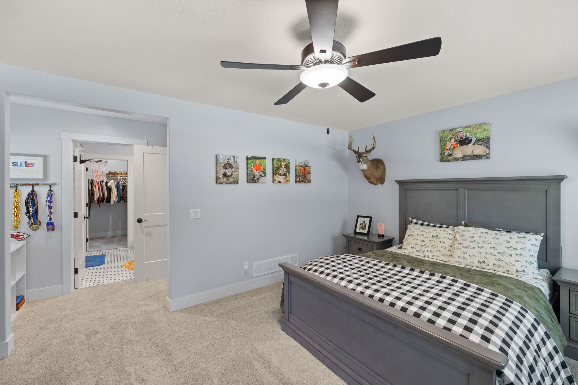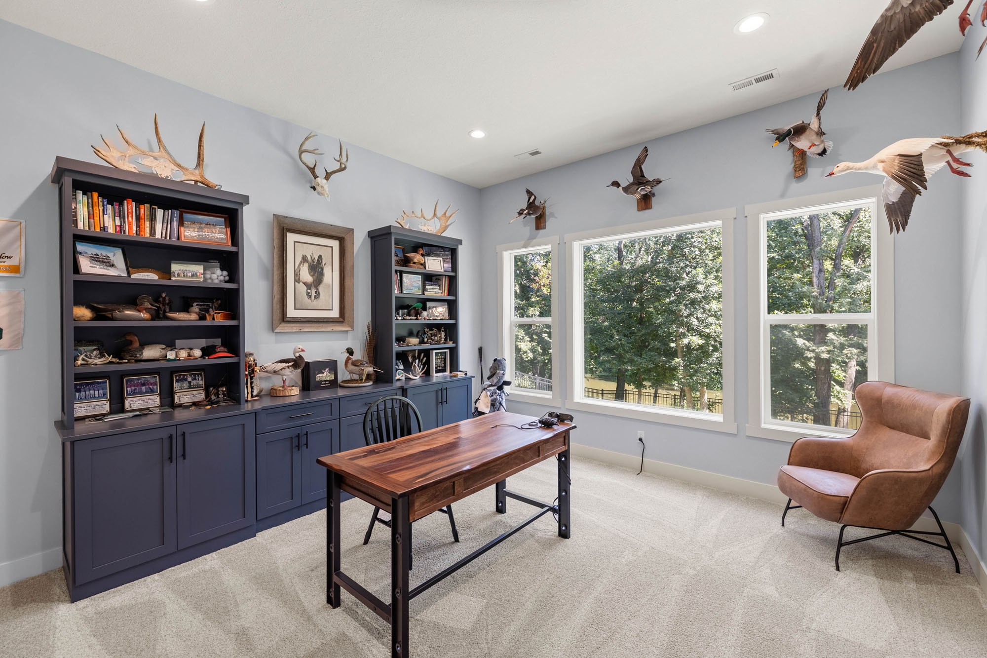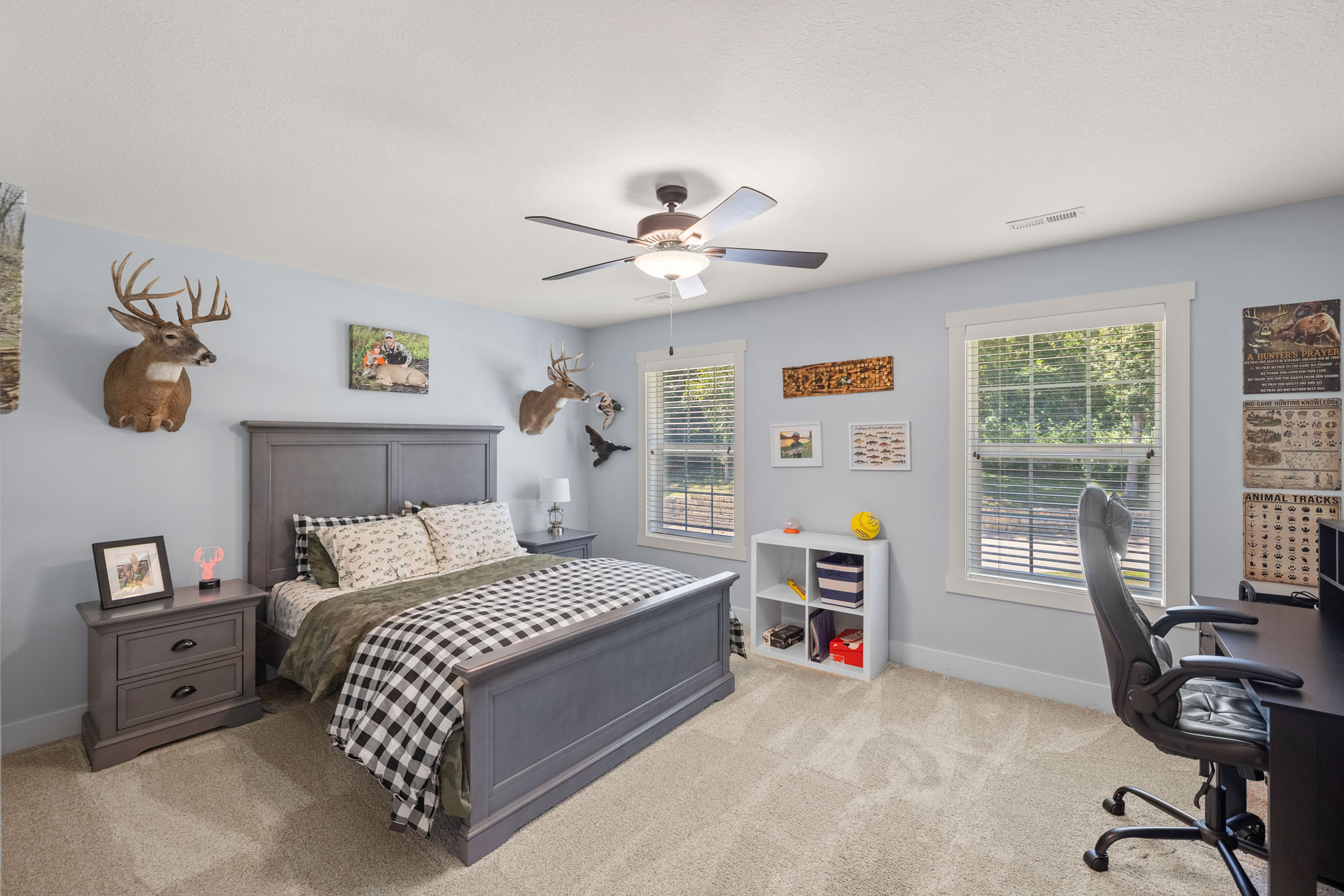 There’s even more outdoors. The fully stocked pond features bluegill, crappie, perch, catfish, and bass, great for fishing. Warm weather welcomes kayaking and swimming, while winter turns the area into a prime spot for ice fishing or skating. A sandy beach is also available. Further outside highlights include a fully irrigated lawn, fenced backyard, an invisible front yard fence, and ample parking for guests and gatherings.