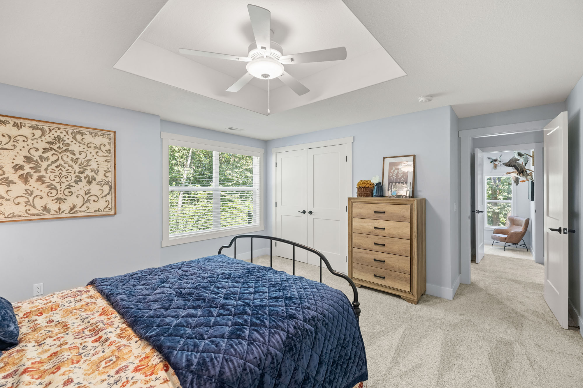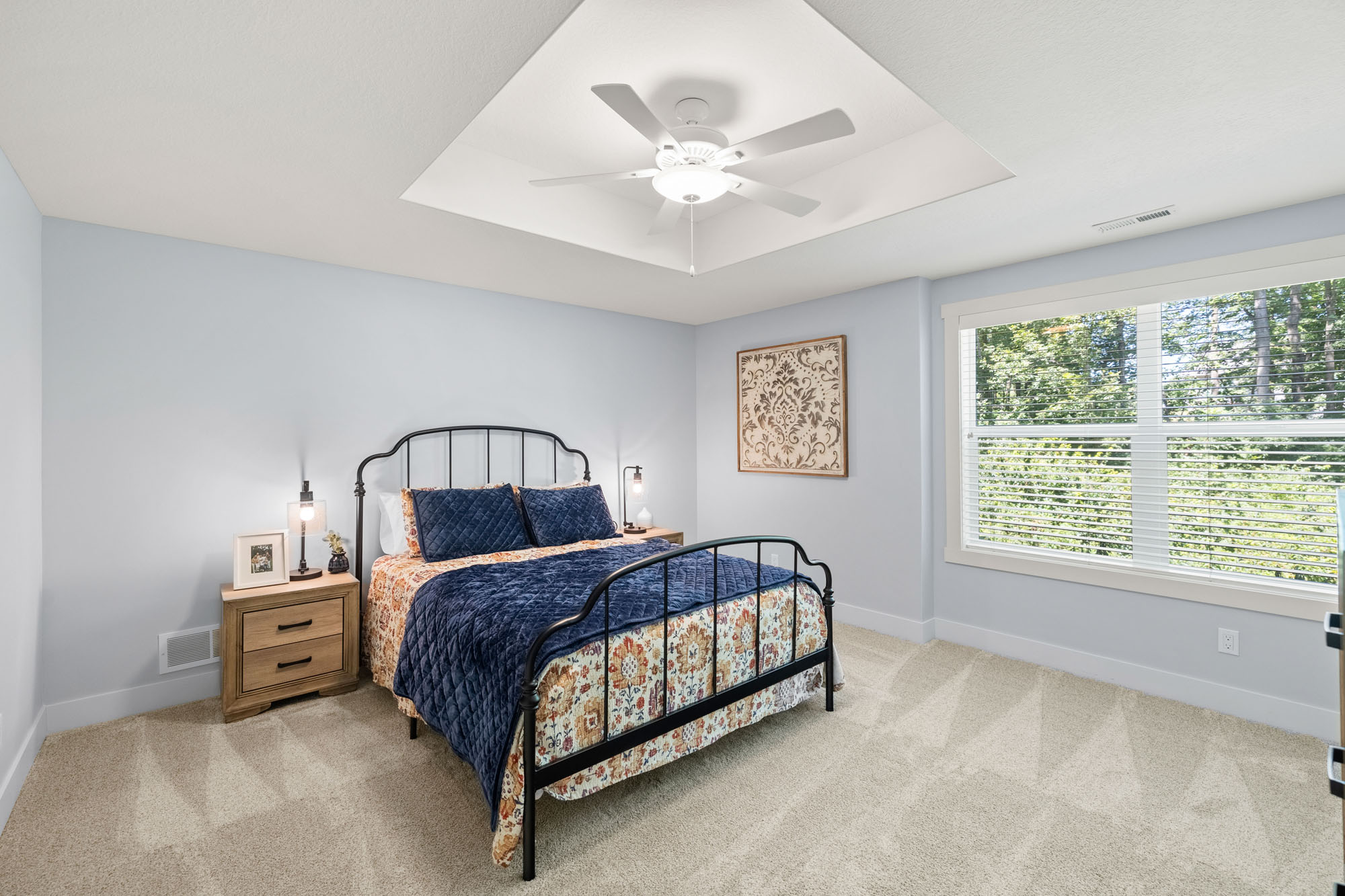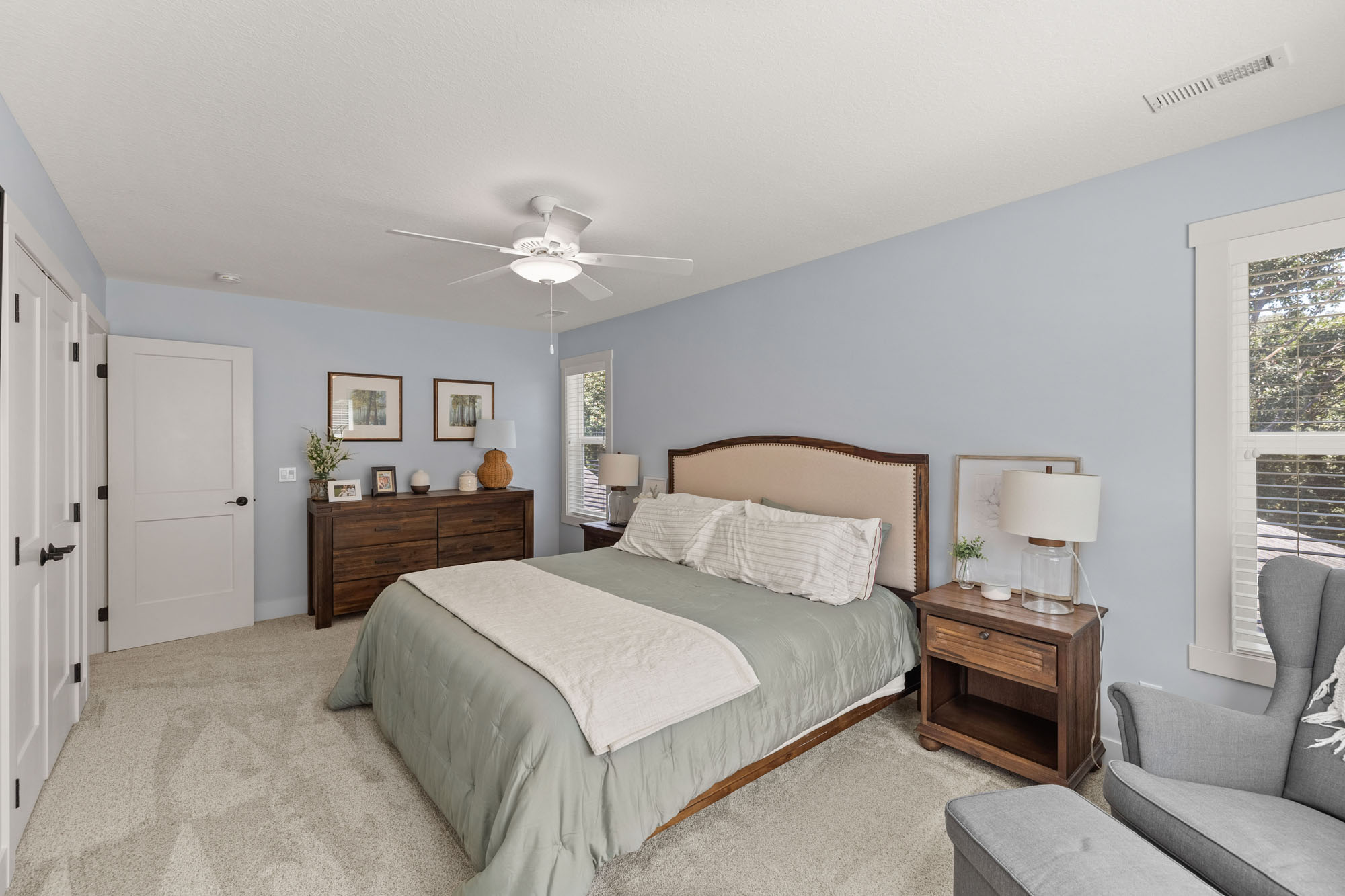 One advantage of a 1.5-story design is the main-level primary suite, offering convenience with all essentials on one floor.
