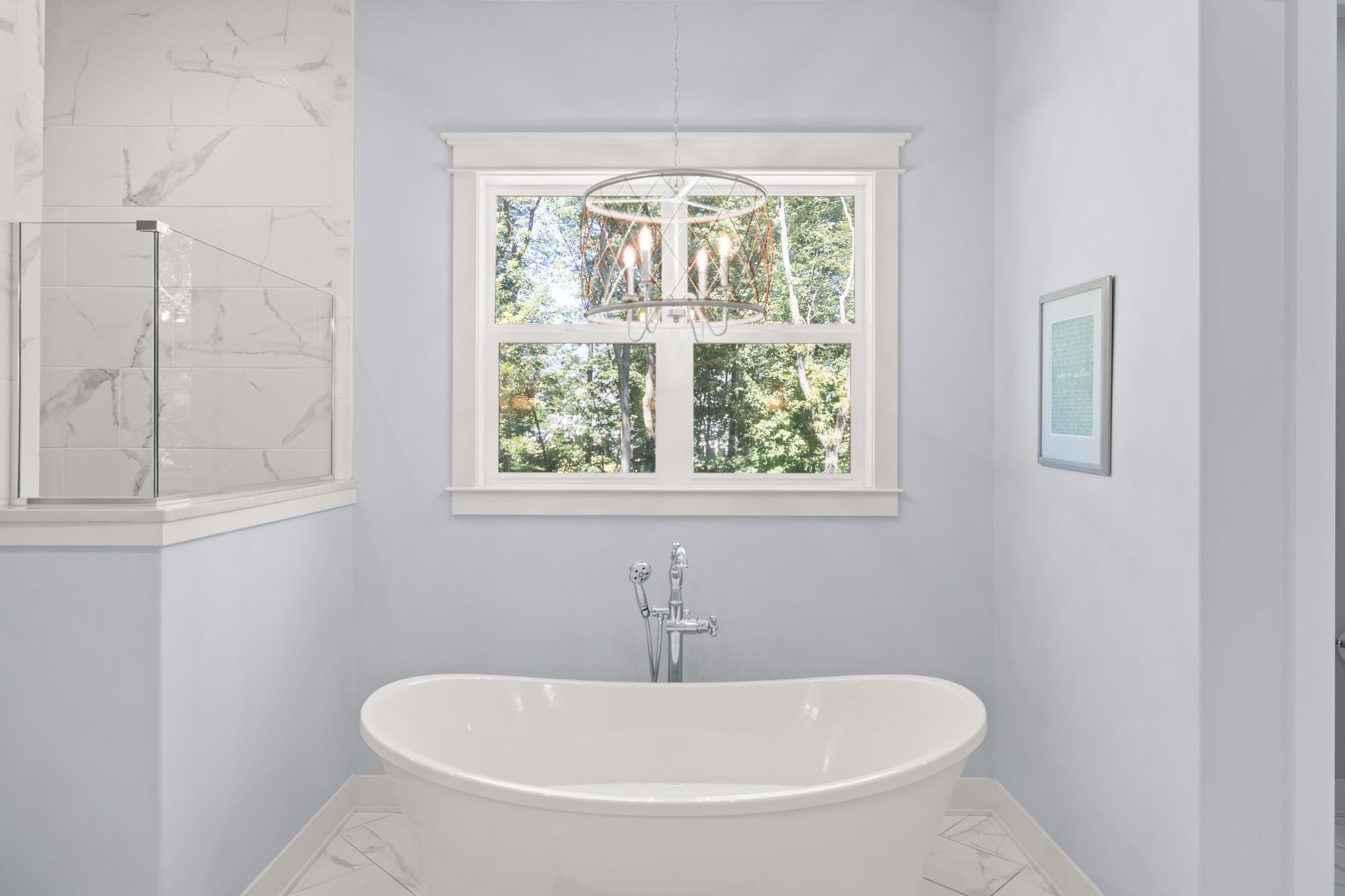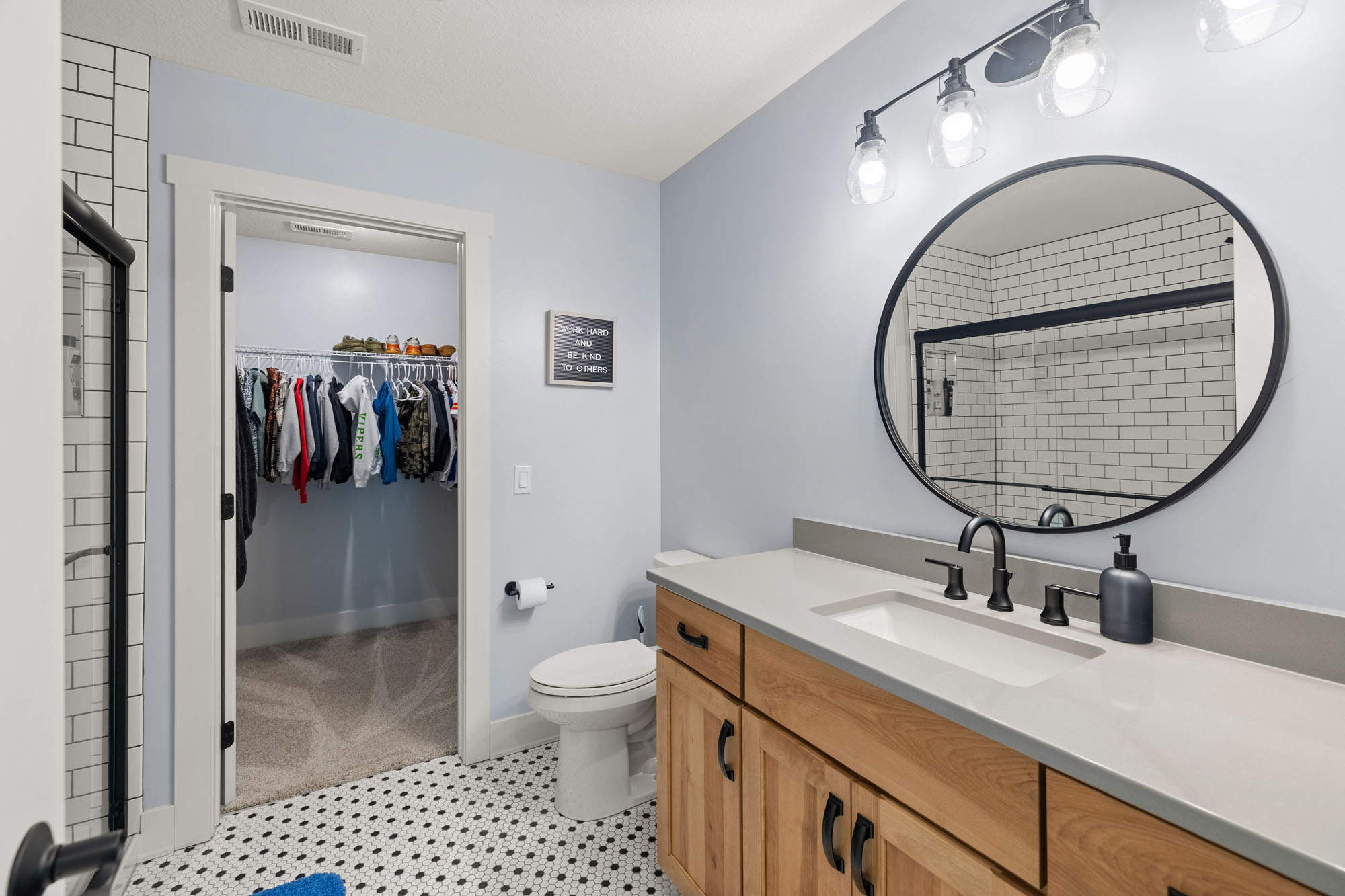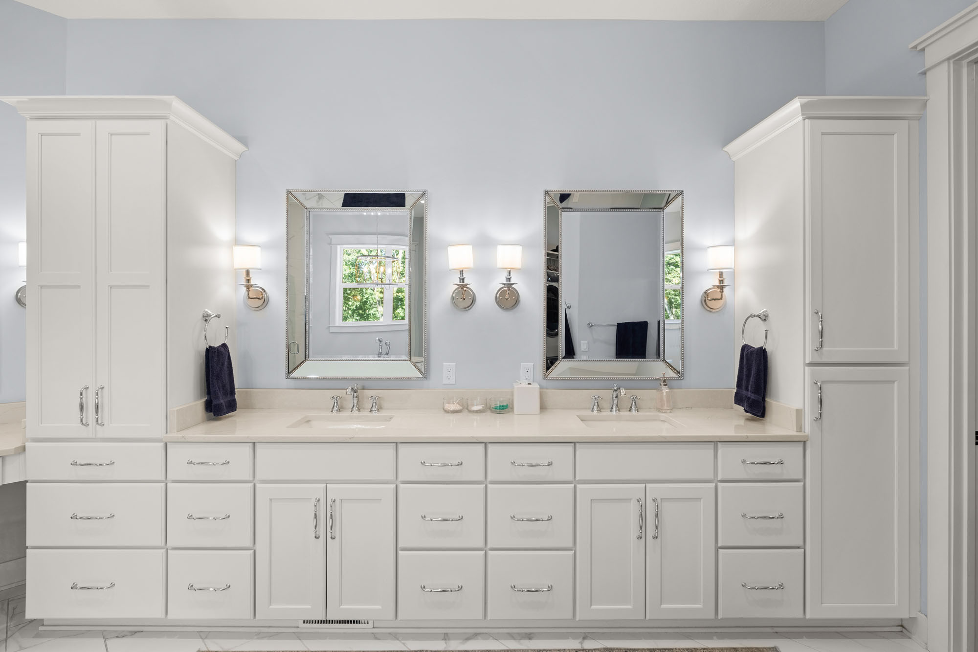 One advantage of a 1.5-story design is the main-level primary suite, offering convenience with all essentials on one floor.