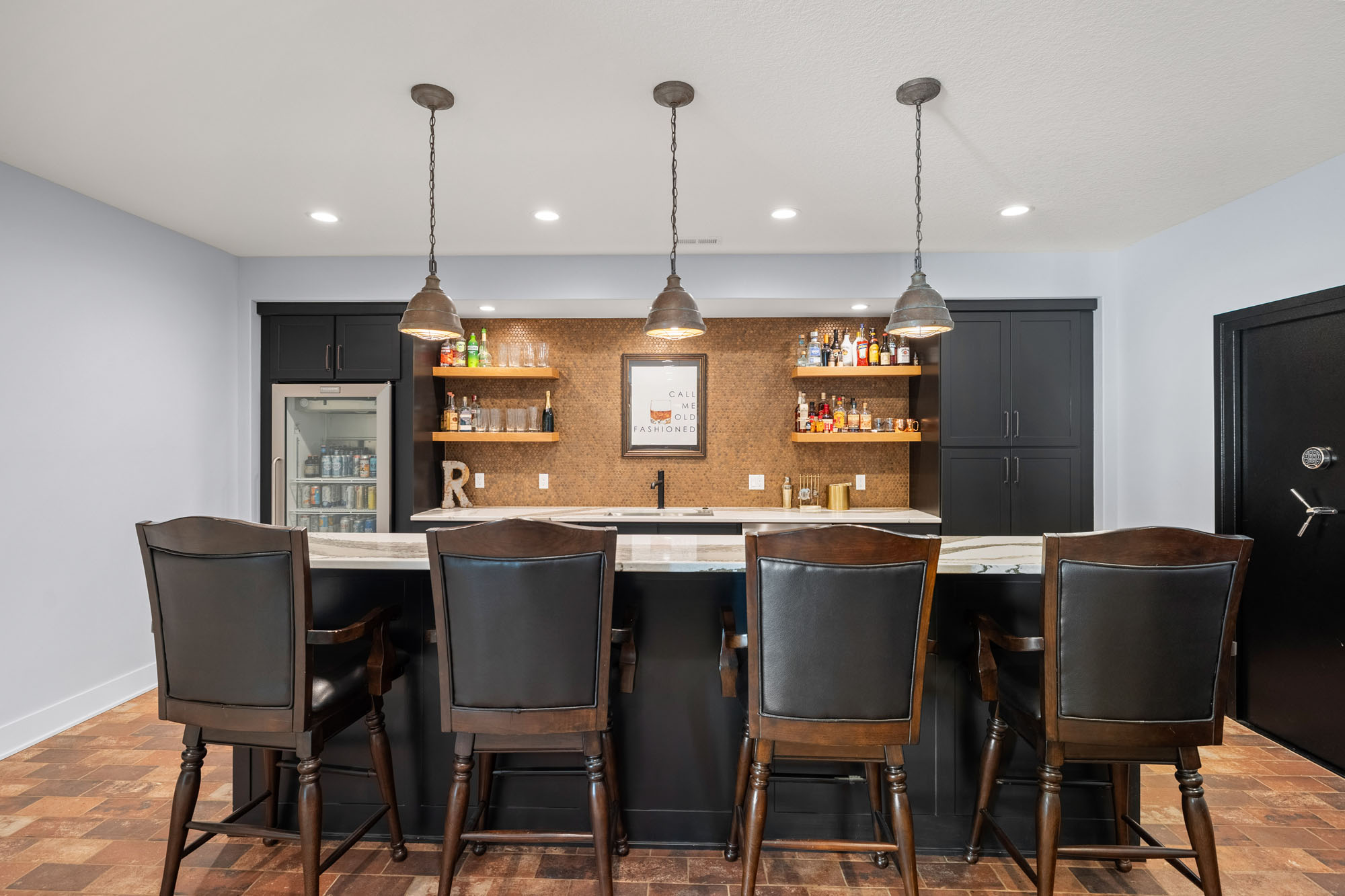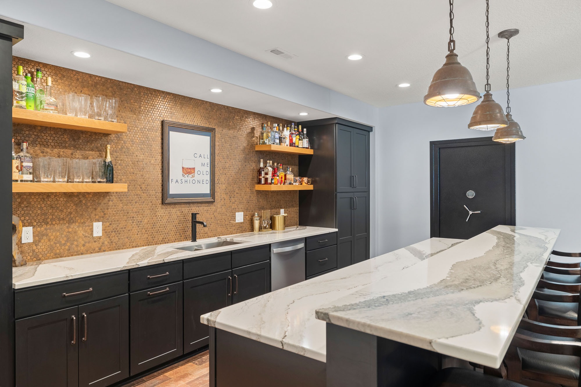 Just beyond is an impressive bar, with plenty of counter space and storage to accommodate parties of any size. Who needs to go to the bar when you can bring the bar to you?