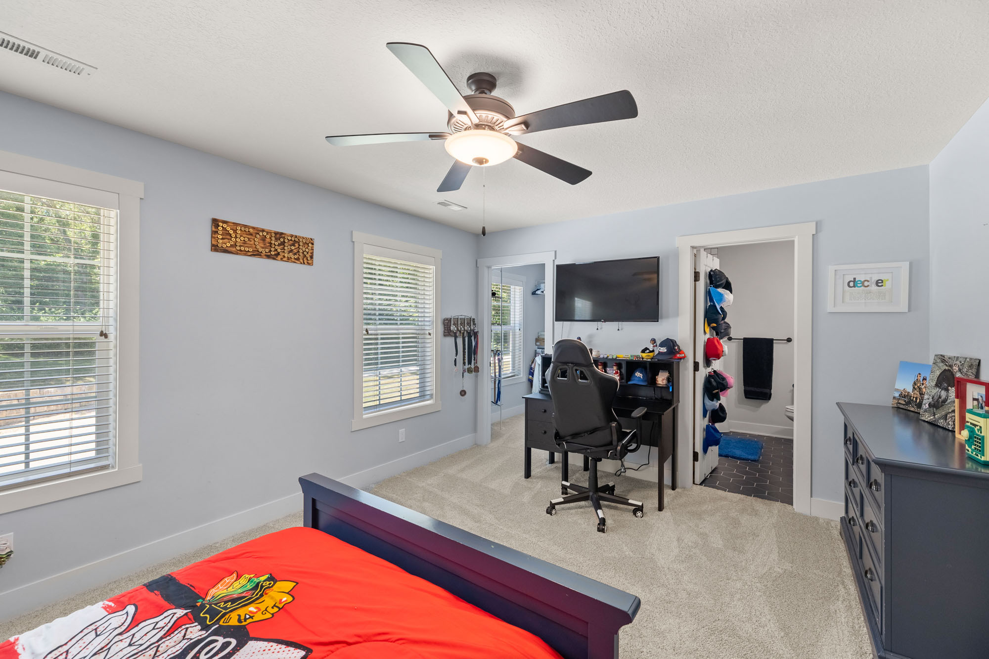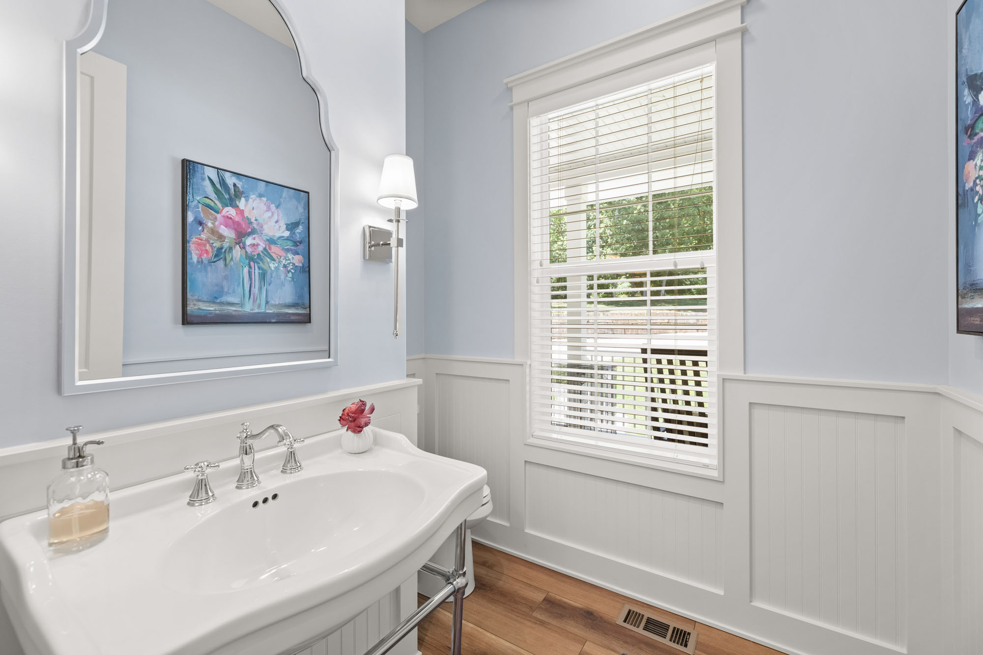 Descend the stairs to find a private office overlooking the backyard, ideal for working remotely or as a creative nook. A separate bedroom with a full bath provides guests with their own private area, away from main activity spaces.