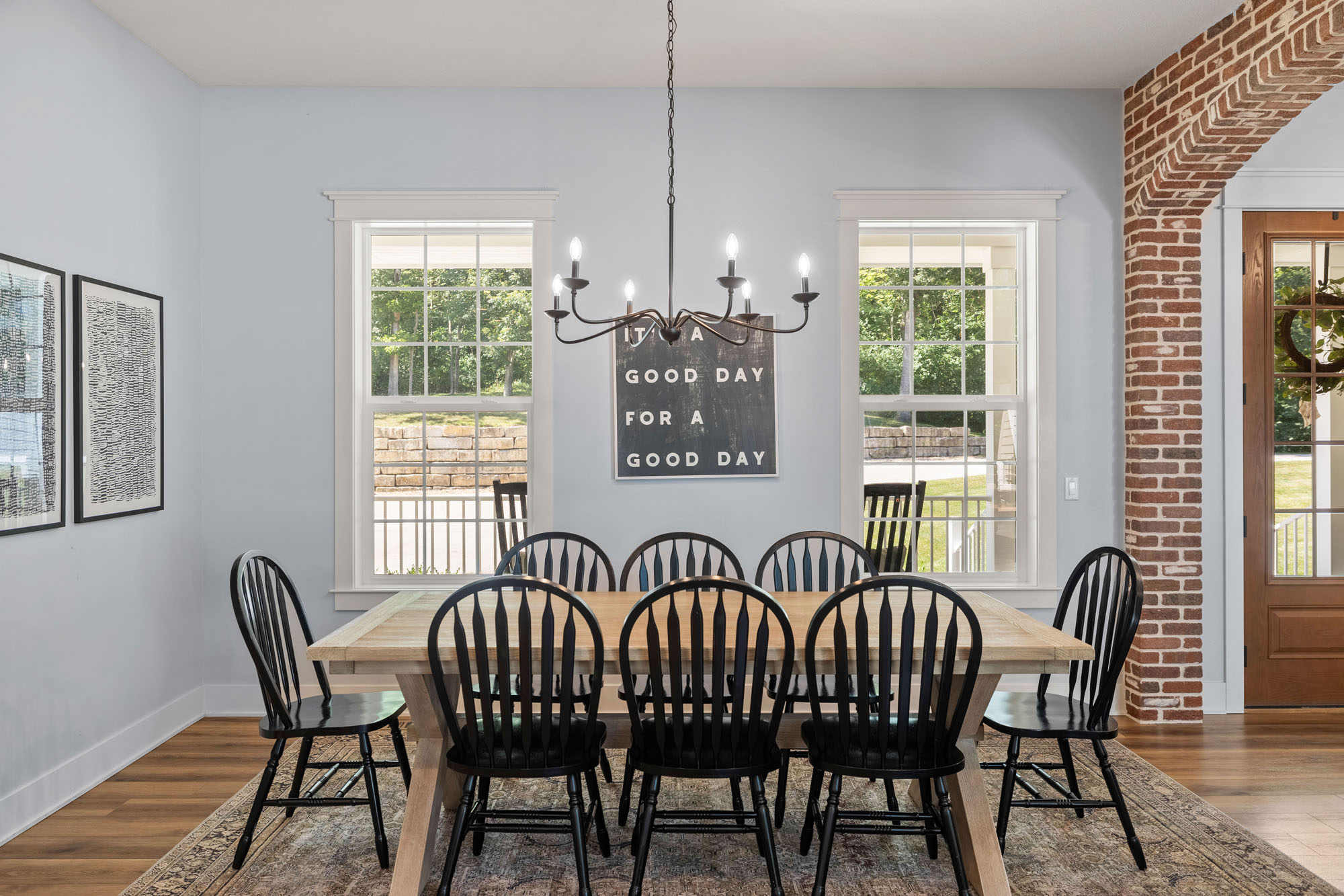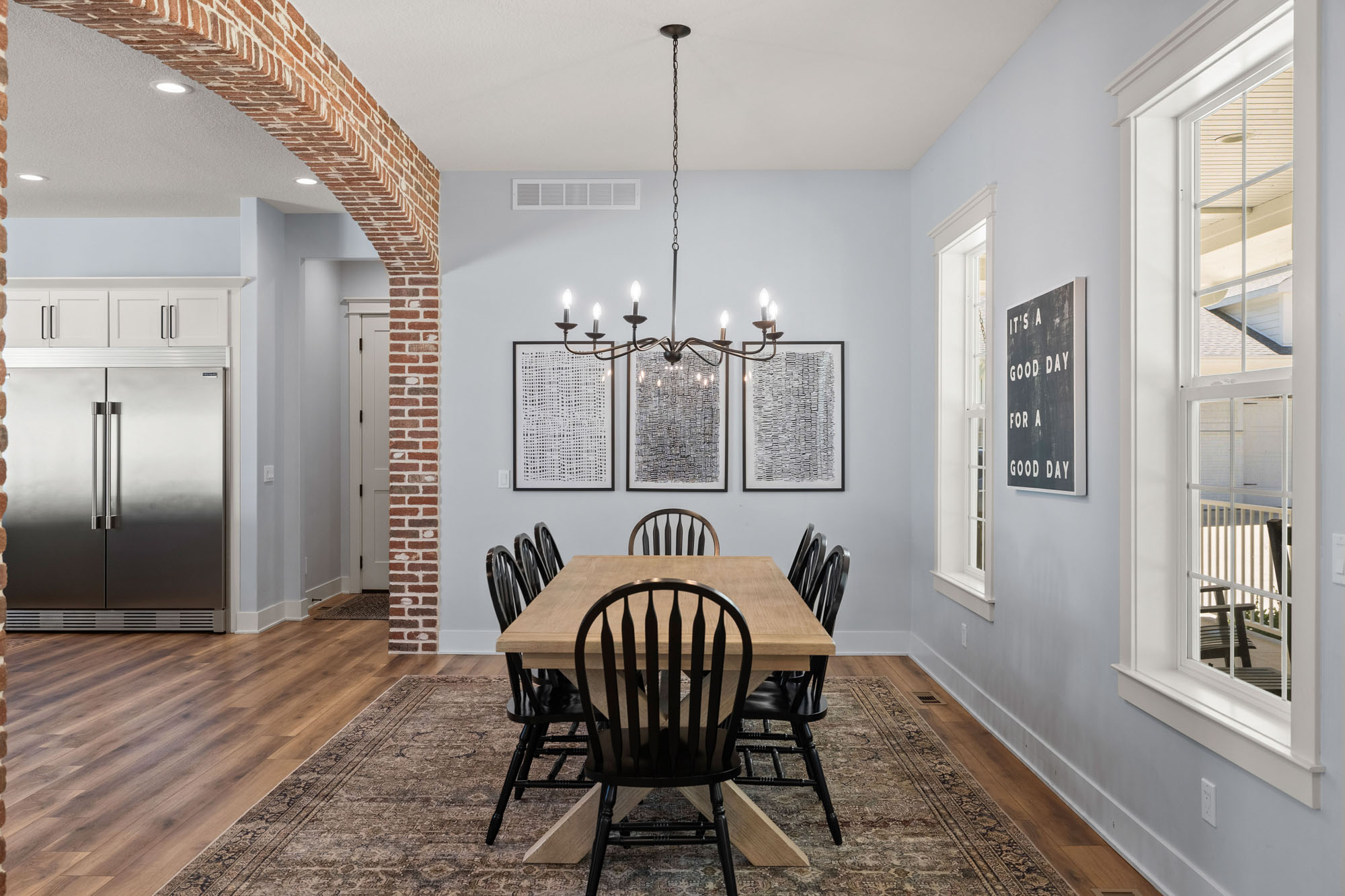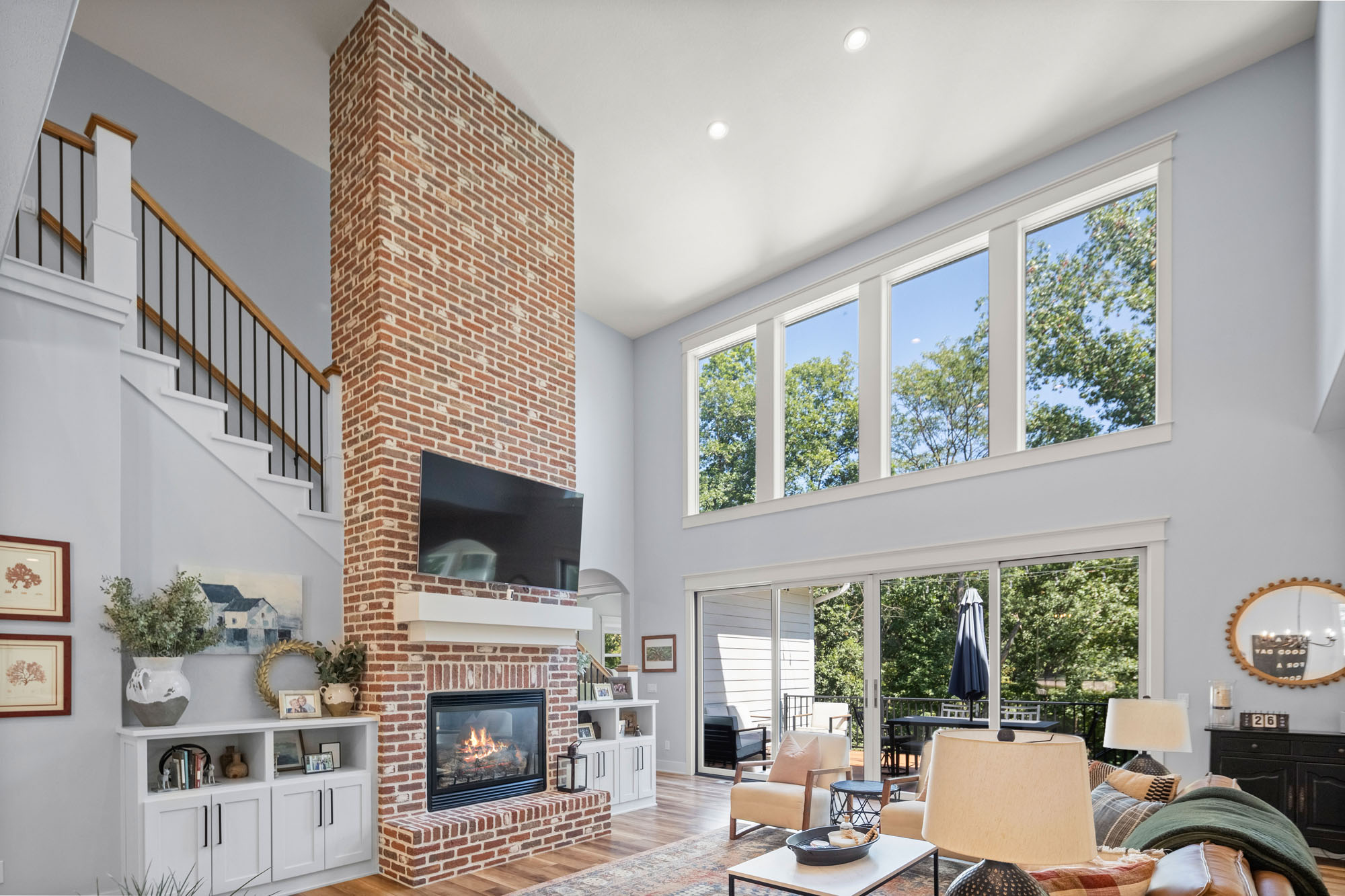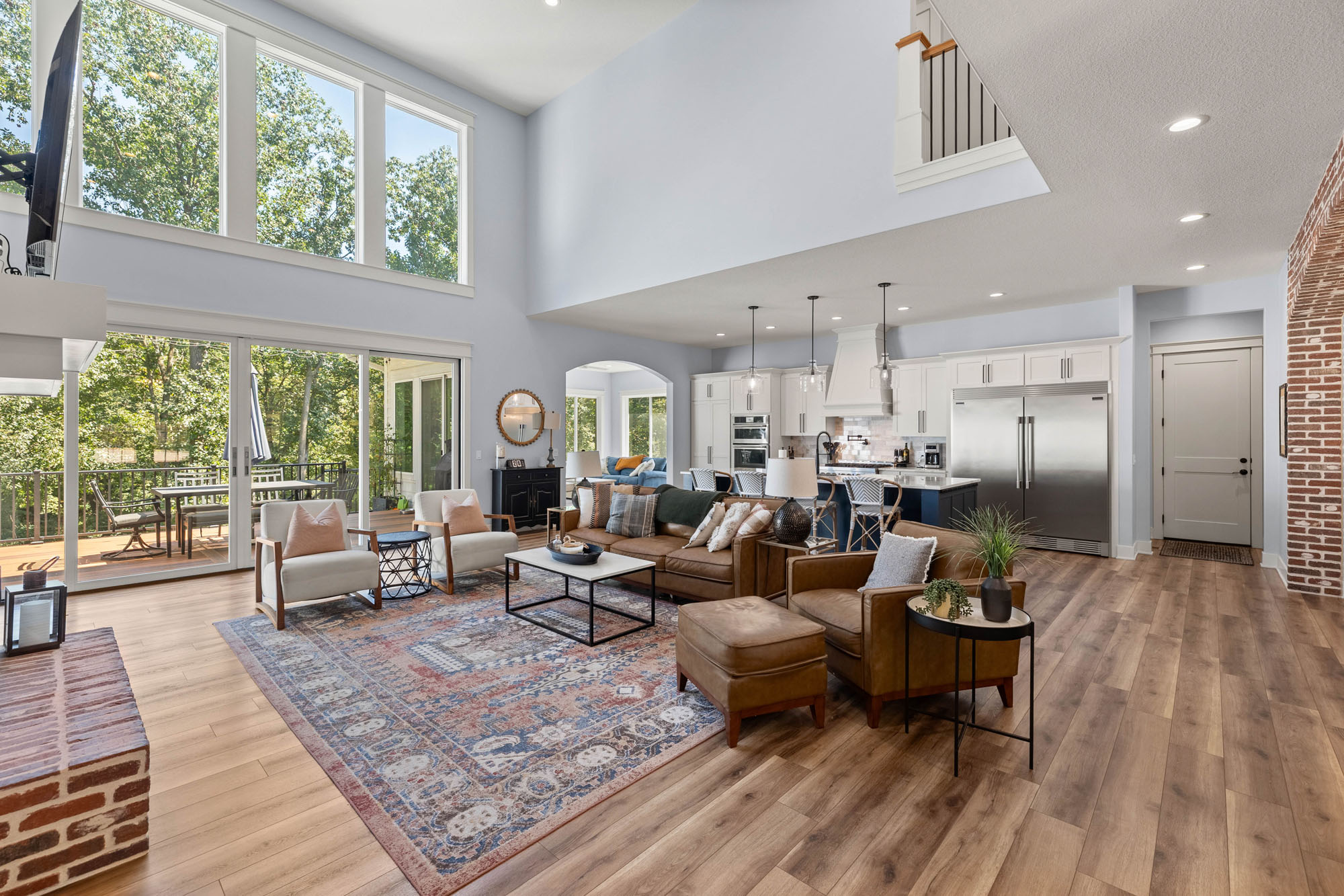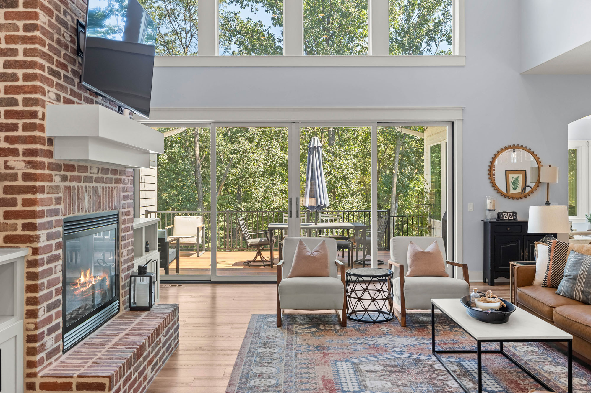 The dining space sits beneath brick archways, blending modern finishes with timeless accents. Nearby, the living room centers around a dramatic two-story brick fireplace flanked by built-ins and soaring ceilings. Large windows and glass doors highlight views of the wooded landscape and lead to the deck, creating seamless indoor-outdoor living filled with natural light.