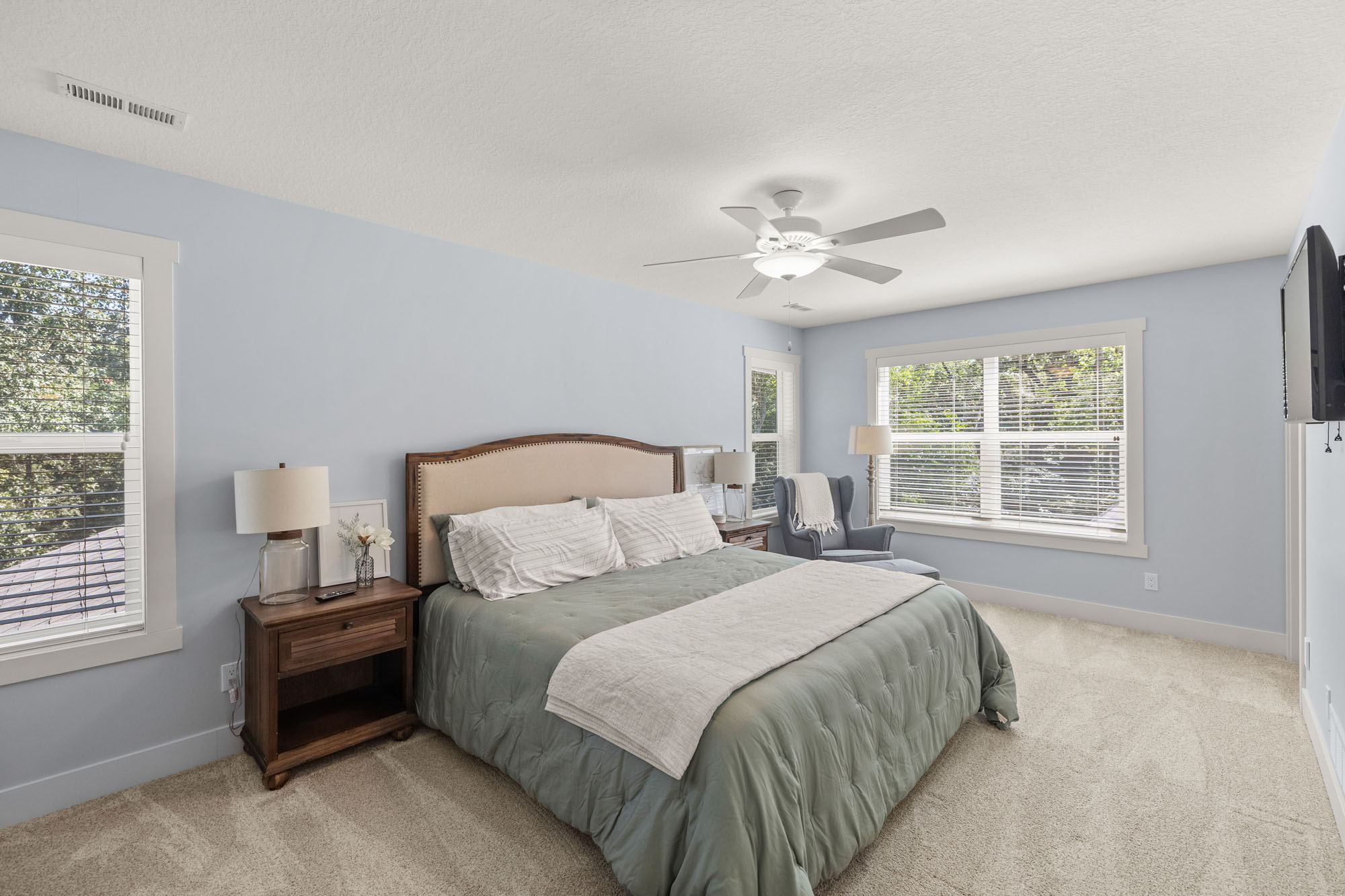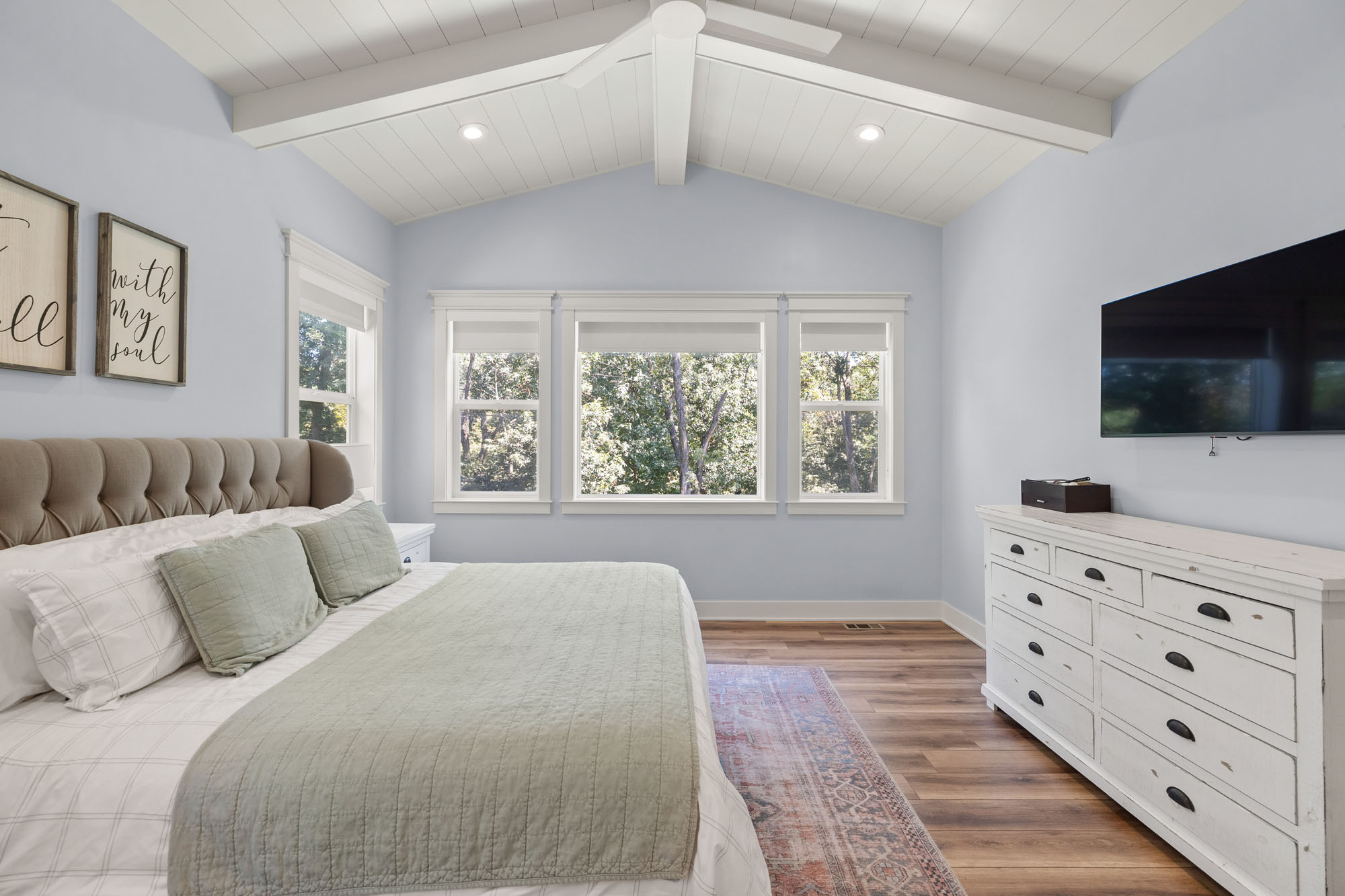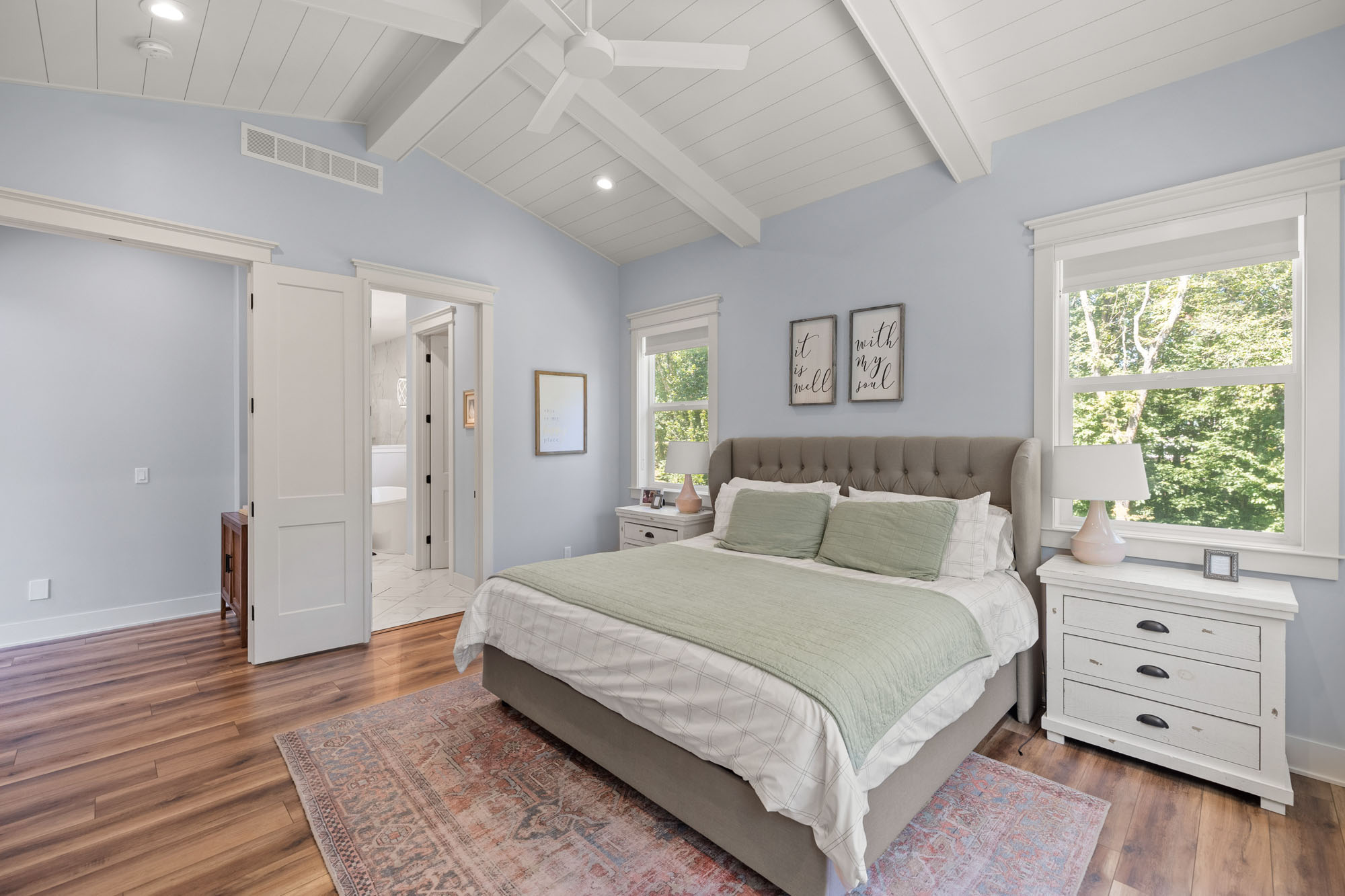 Just off the great room, the primary bedroom boasts abundant sunlight and secluded forest views. A vaulted ceiling with shiplap and beams evokes East Coast beach charm – a nod to the sellers’ origins.