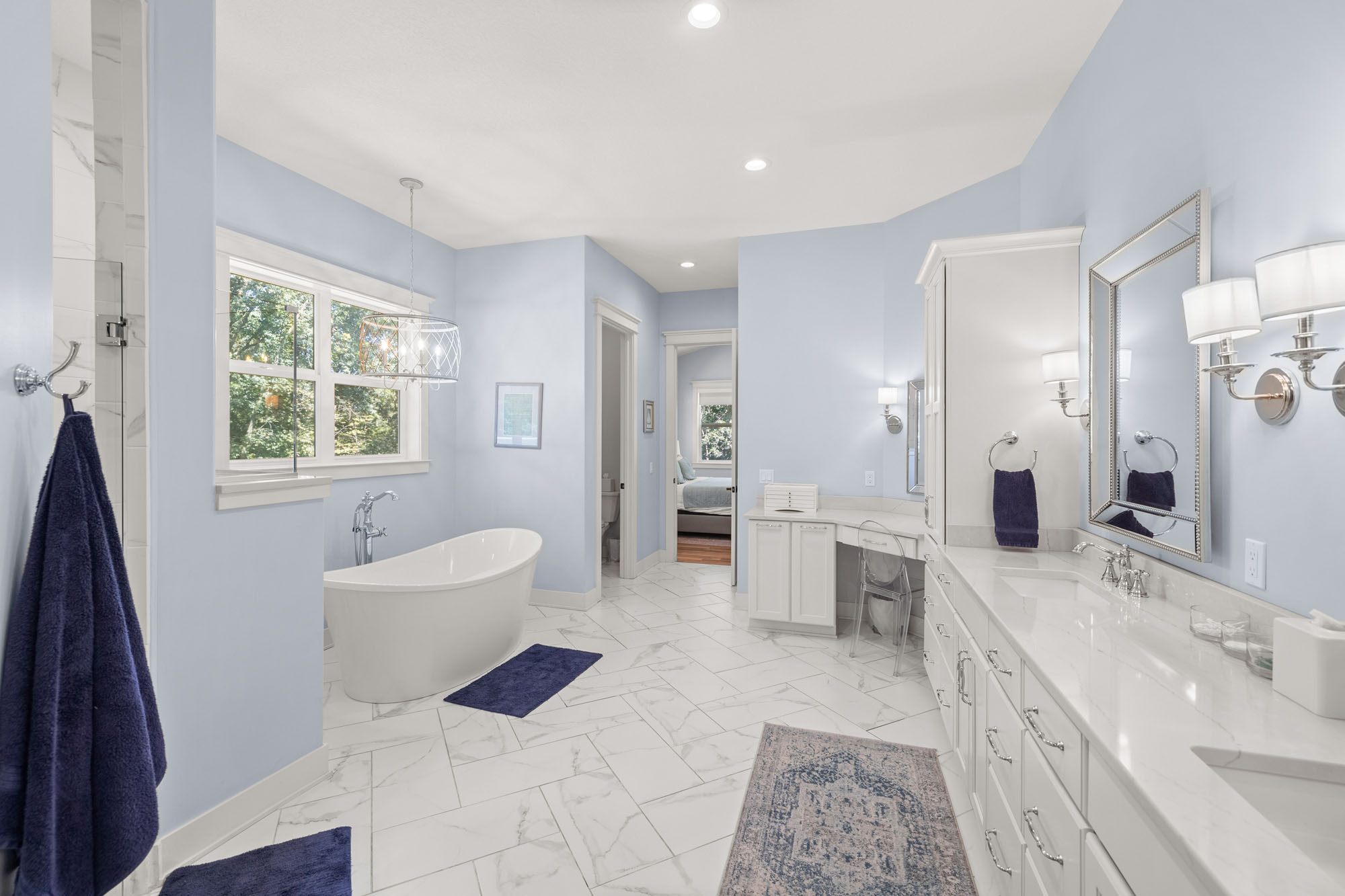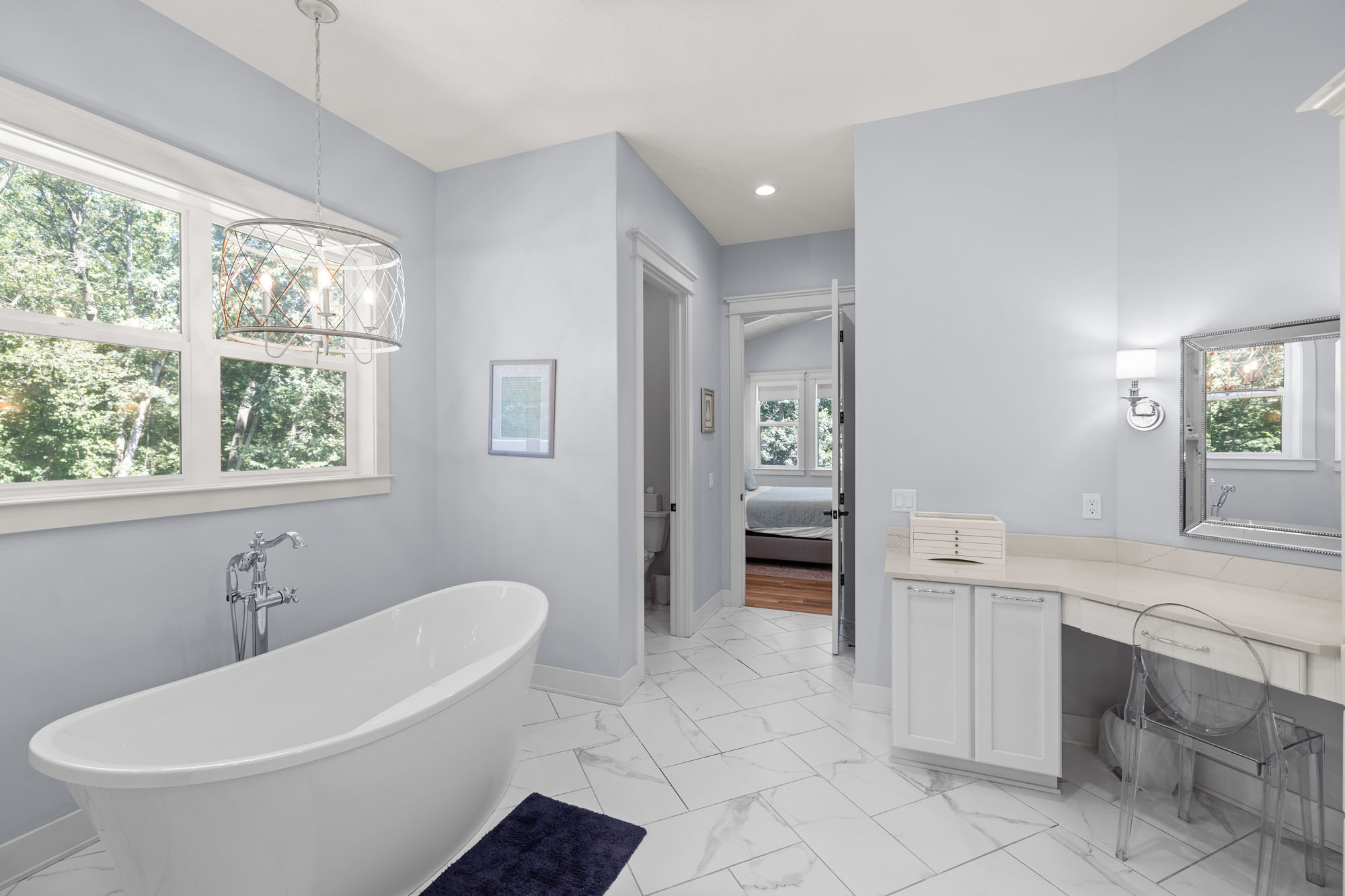 The en suite bath is bright and thoughtfully arranged, with a private toilet closet, soaking tub, roomy shower, dual sinks, and extensive counter space. The walk-in closet includes a stacked washer and dryer, so laundry is always close at hand (with laundry facilities on both main and upper levels).